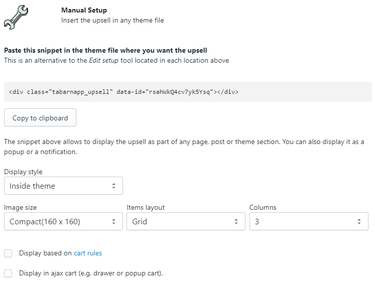 Note: do not click on any upsell location (on the "Select" button) if you use the manual snippet of code. For example, clicking on "Select" in the "Product page" location will display the upsell automatically.